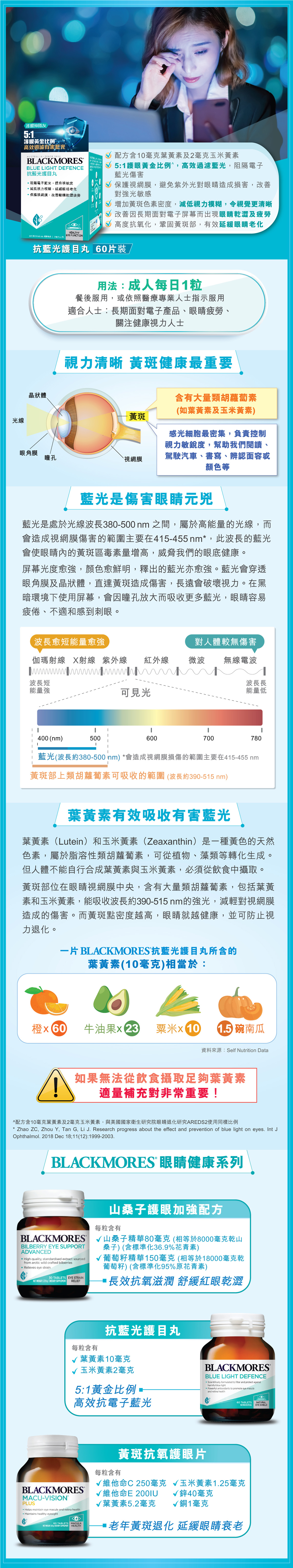 BLACKMORES® Blue Light Defence is scientifically formulated with marigold extract that contains natural Lutein and Zeaxanthin. The optimal 5:1 ratio is effective to increase macular pigment and filter the harmful blue light. This in turn protects the macular region and minimise the harms from screens to our eyes.