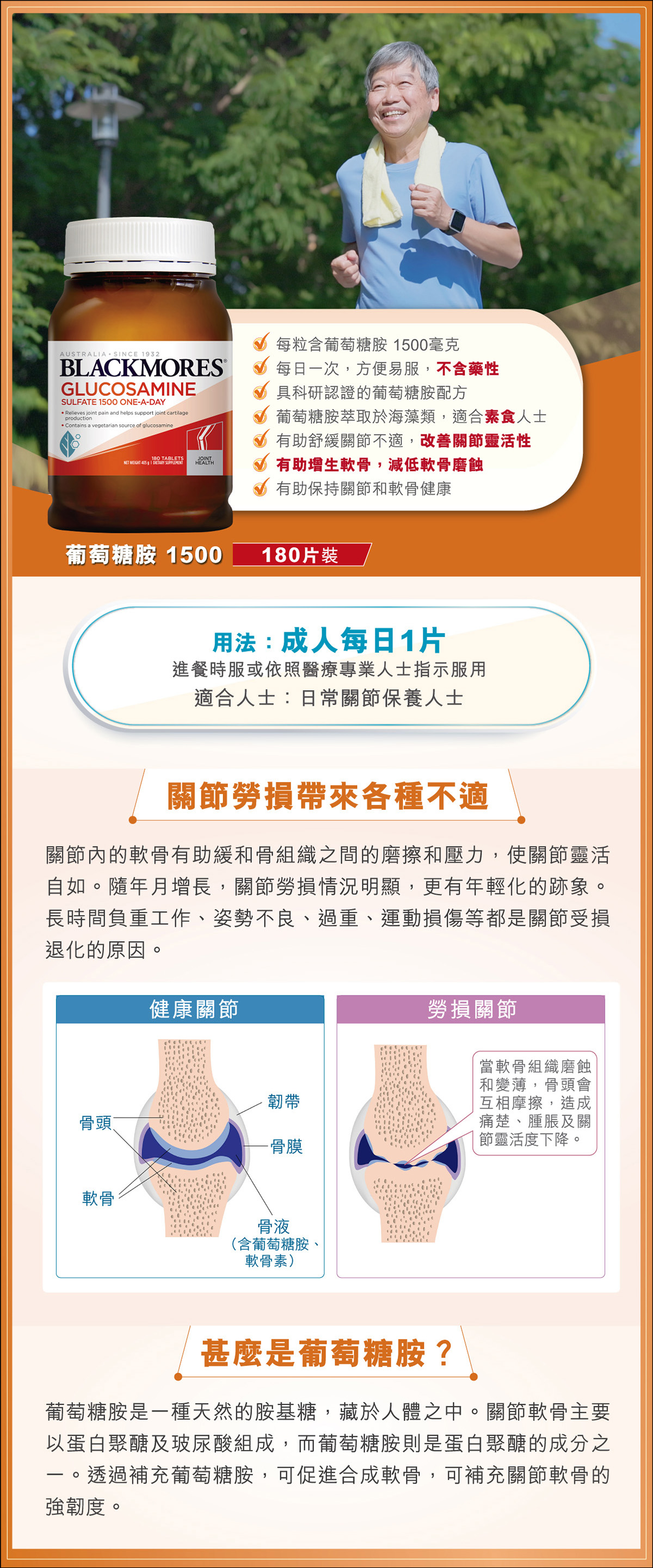 Blackmores Glucosamine 1500 helps provide joint relief by reducing cartilage wear, increasing mobility and decreasing joint stiffness